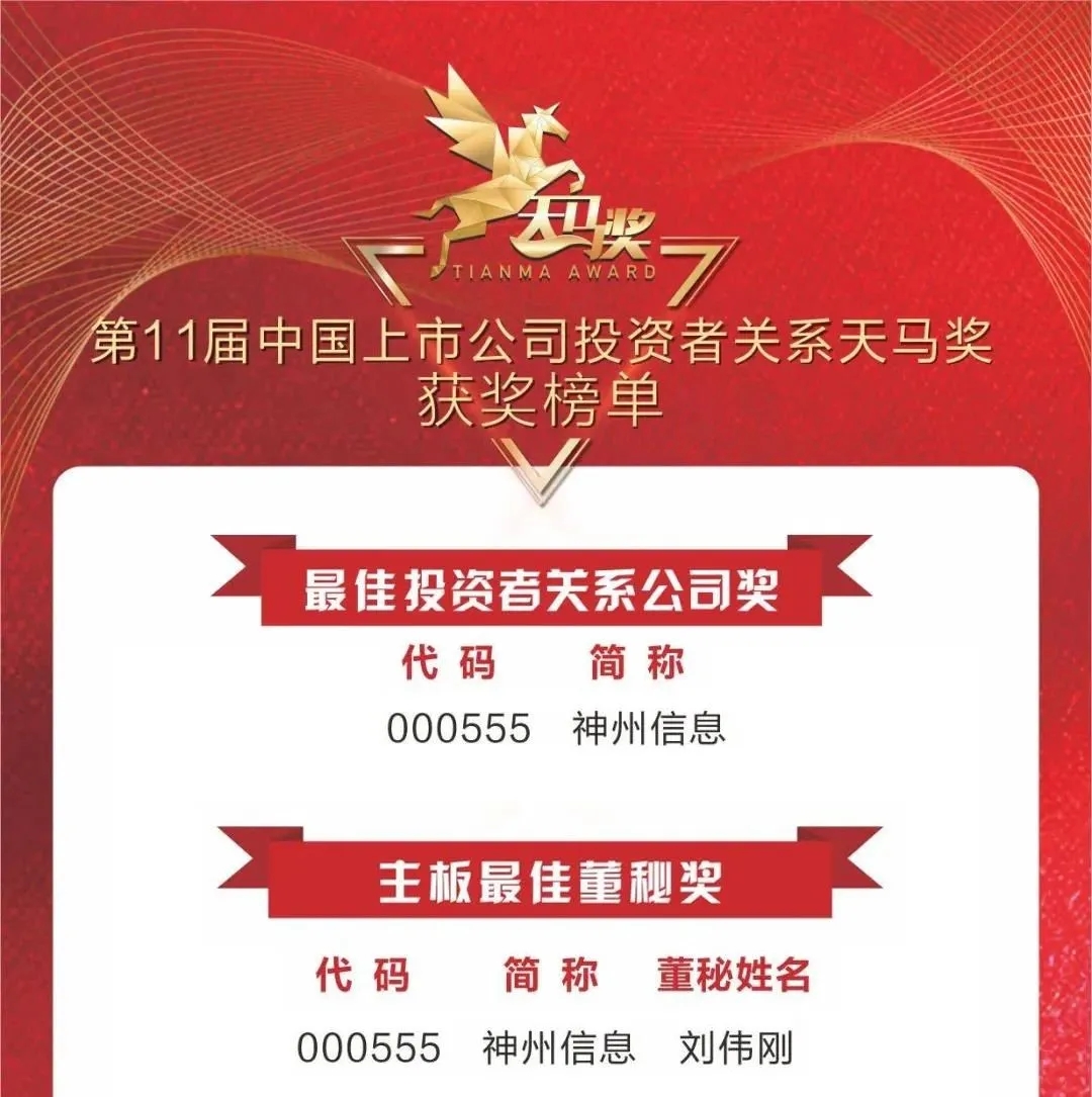第11届天马奖榜单出炉,神州信息获“最佳投资者关系公司奖”、“主板最佳董秘奖”两项大奖!