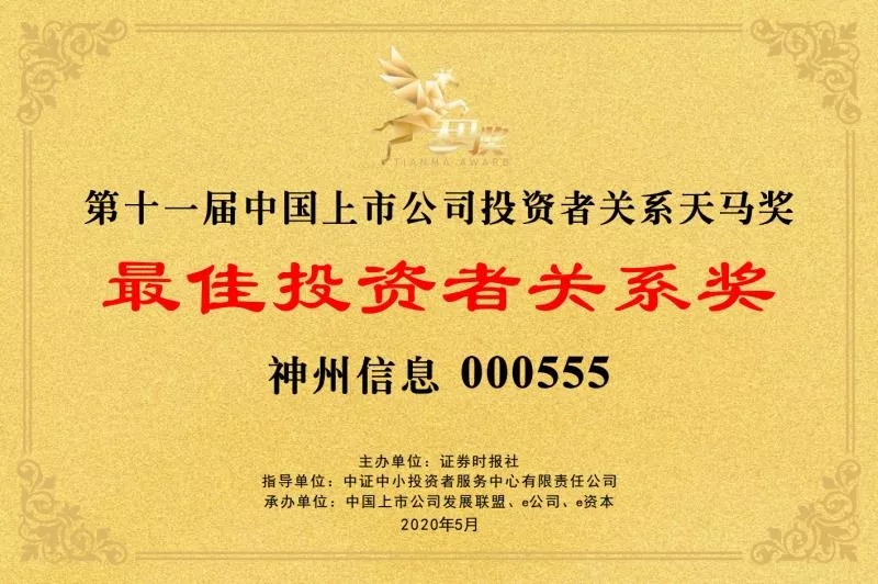5月13日,由证券时报社主办,中证中小投资者服务中心担任指导单位的“第11届中国上市公司投资者关系天马奖”获奖榜单新鲜出炉。神州信息登榜“最佳投资者关系公司奖”,公司董秘刘伟刚摘得“主板最佳董秘奖”。